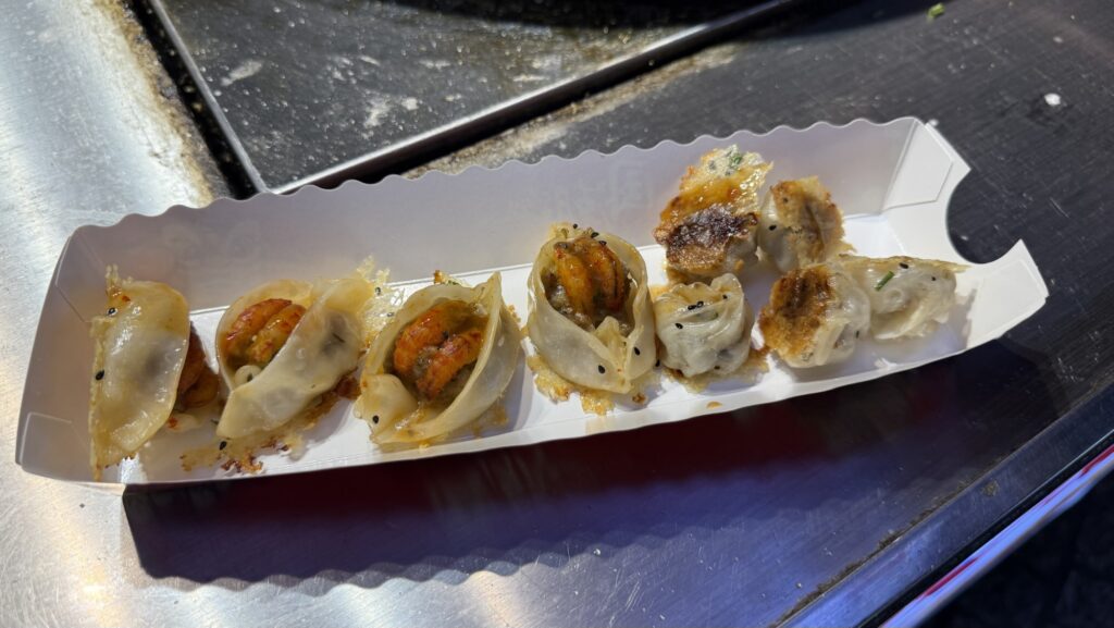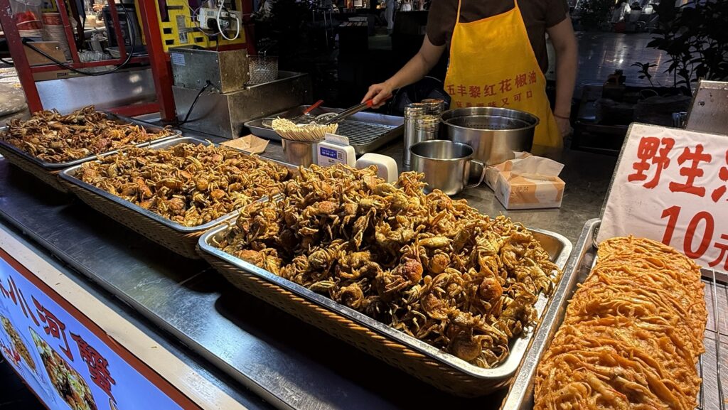 右側。野生の河エビのかき揚げ。その場で揚げなおしてくれるのでサクサク(10元、約200円)。