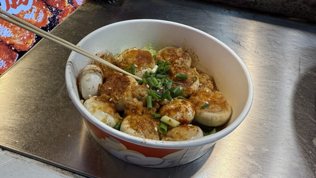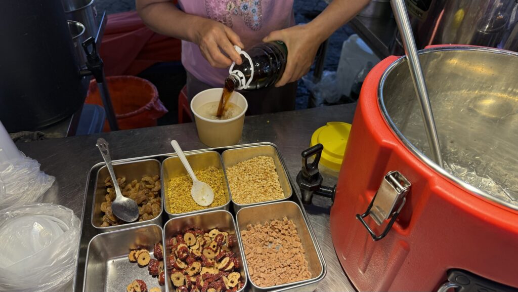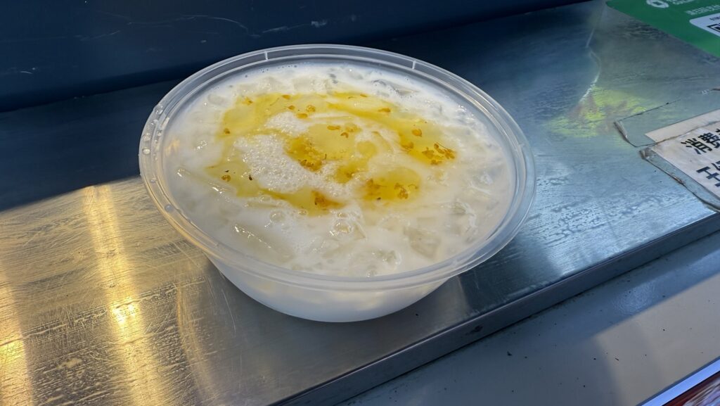 甘酒のような感じですがアルコールはほとんど感じられず、あんみつみたいなイメージでしょうか。これも桂花(金木犀)のシロップで味付けするのが定番らしく、「桂花甜酒醸」で10元(約200円)。