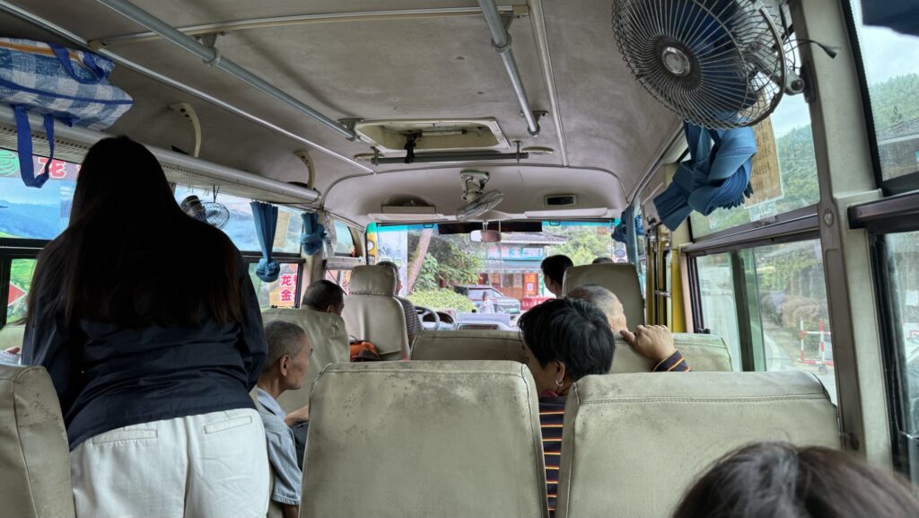 バスにはおそらく時刻表はなく、ルートを循環しているものに適当に乗る方式です。車体は小さなマイクロバスでローカルの村人っぽい人も乗っています。