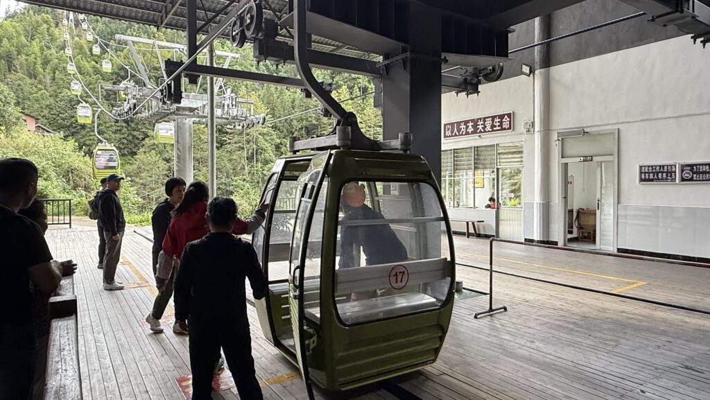 普通のロープウェイは乗車エリアでワイヤーを切り替えて乗車しやすいスピードまで減速しますが、ここは切り替えがなく早いままで来ます。乗降するときちょっと怖い。