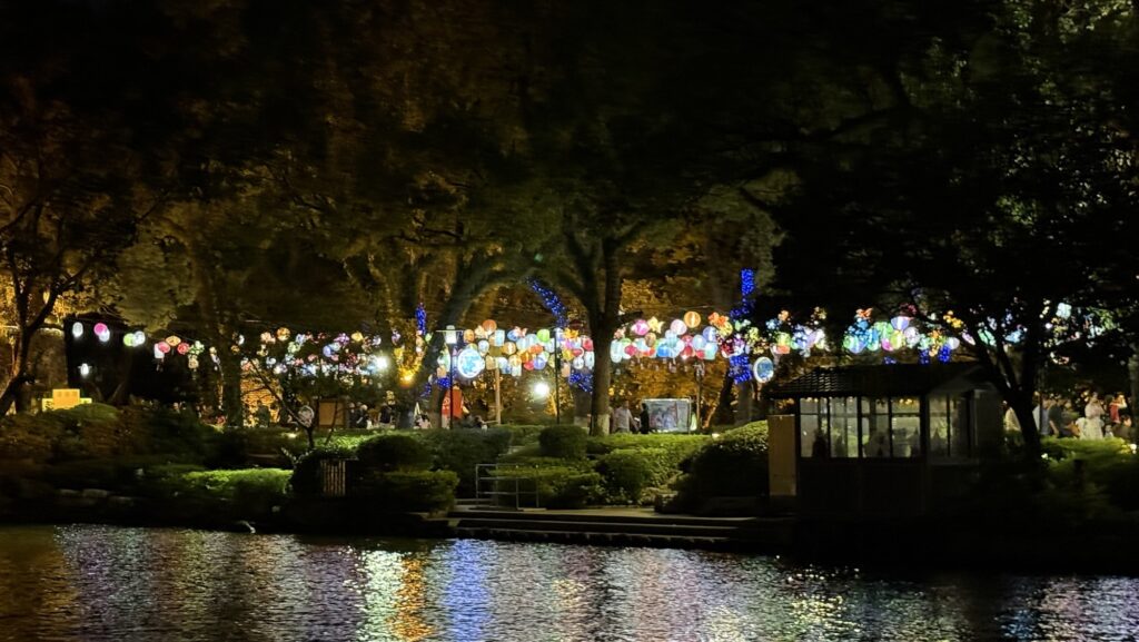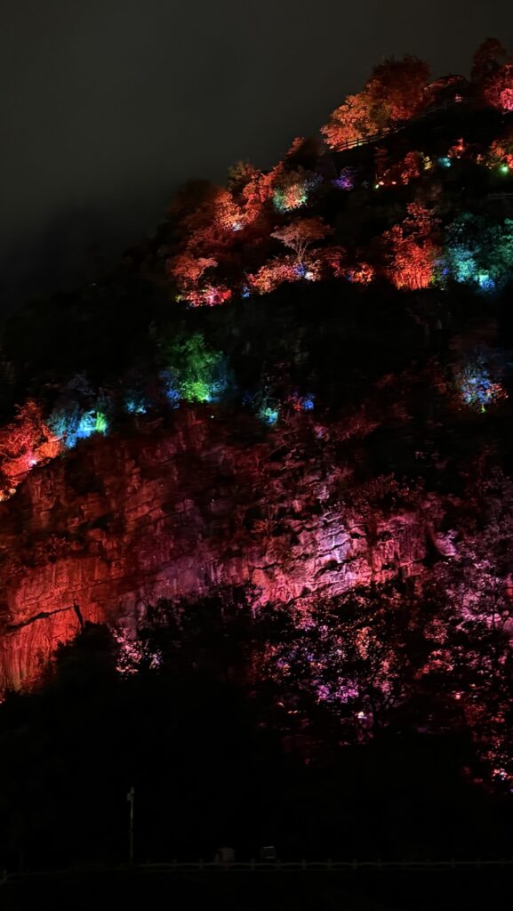先日登った畳彩山。水路沿いはところどころ観光向けにライトアップされています。
