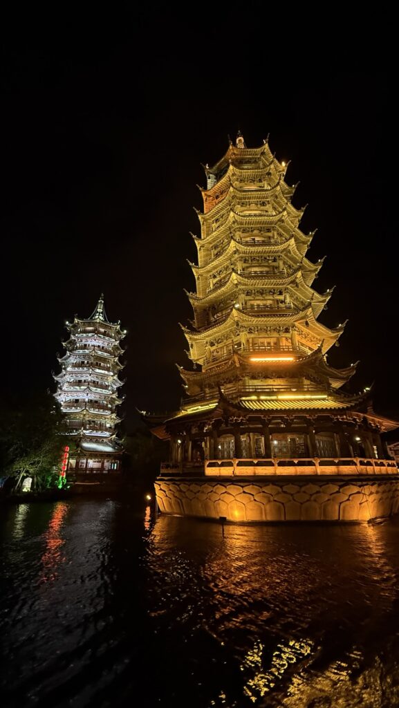 両江四湖ナイトクルーズは、広西チワン族自治区桂林市の中心部を一周する環状水路を巡る観光船事業です。漓江、桃花江の二つの川と、杉湖、榕湖、桂湖、木龍湖の四つの湖を連結しており、総延長は約7.3キロメートルに及びます。この航路は、かつて宋代に築かれた堀を再整備する形で2002年に開通しました。