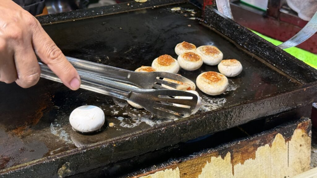 ホワイトマッシュルーム(口磨)の中にエビのペーストを詰めて団子状にしたもの(26元、約520円)。