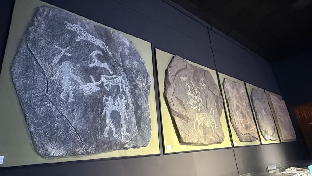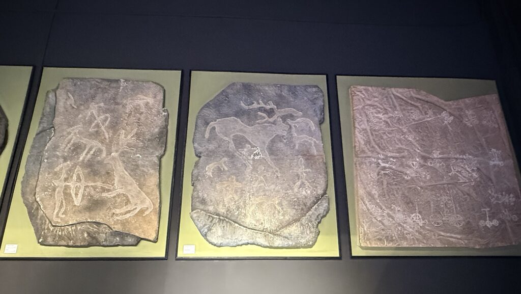 館内は時代別に展示室が分かれています。1Fには先史時代の石器・土器など。岩絵は紀元前1500-300年前のもので、1辺1メートル以上と大きくて状態もいい。タバン・ボグドやゴビとかで野ざらしのものも見ましたが、価値が高いものはこうして保存してるのでしょう。