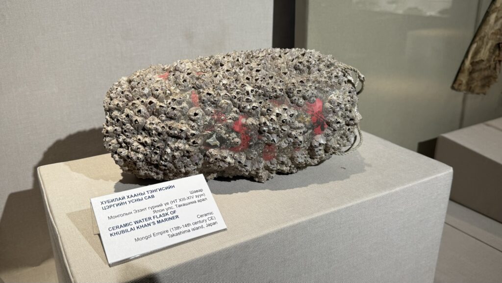 瓦とかカラコルムの発掘品も展示されていました。変わったデザインの水筒だなと思ったら、元寇の時に日本の海底に沈んでいたものでした。