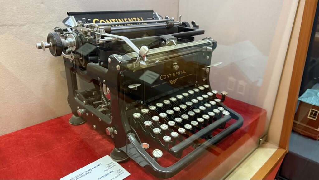 モンゴル文字のタイプライター。モンゴル文字は縦書きなので、紙と文字を90度回転させて左から右へ印字し、取り出して元に戻すと縦書きで読めるようにしていたらしい。1946年にはキリル文字に移行したためごく短期間だけ使われていたそう。