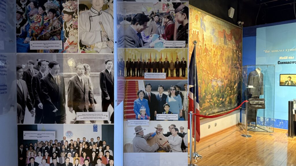 モンゴルを訪問した日本の皇室や政治家の写真のパネルも。