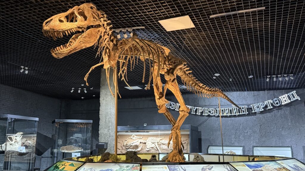 特に注目される展示として、後期白亜紀のタルボサウルス(ティラノサウルス類)骨格標本やプロトケラトプスの卵、恐竜の化石があり、実物標本で展示している点も特徴です。展示動物の剥製(はくせい)や希少な哺乳類、鳥類、鉱物標本なども数多く収蔵しており、モンゴルの自然を学ぶ上で重要な拠点となっています。