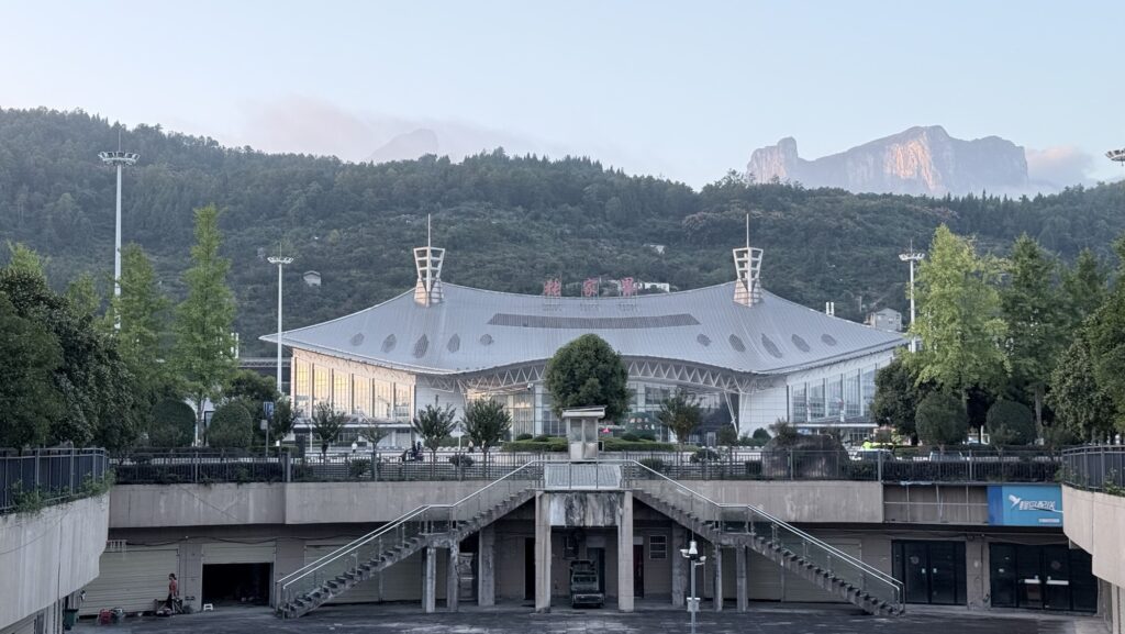 朝7時前、まだ薄暗い時間にホテルを出発。最近、あまり早起きしてなかったので朝がつらい。張家界駅の背後に見える山が天門山かな?