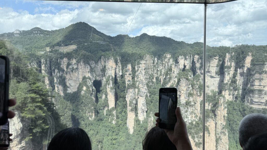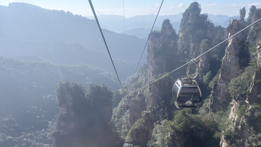 ギネス世界記録において「世界で最も高い屋外エレベーター」として認定されており、山麓から山頂の袁家界(えんかかい)地区までを約1分28秒で結びます。