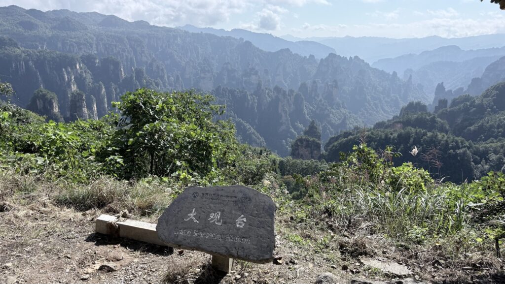田園から少し歩いた先に展望スポットがあり。遠く奇峰の向こうに百龍エレベータが見えます。