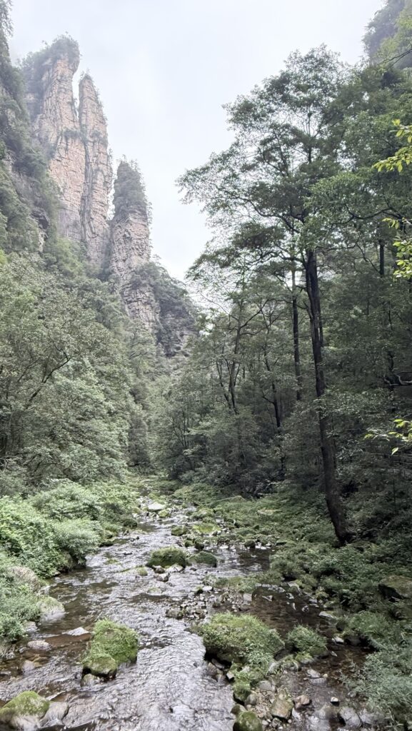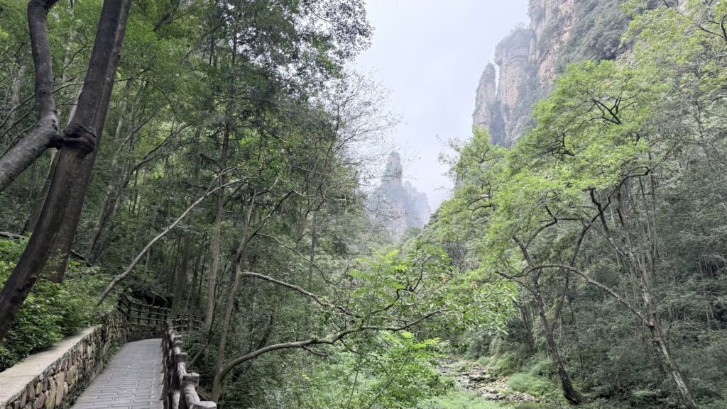 今日はもともと楊家界、黄石寨など西側のエリアに行こうと思ってましたが、ホテルの人から「雨だと高いところからの景色は見えないから、麓を歩いたほうがいいよ」と言われたので予定変更。代わりに勧められた金鞭渓という遊歩道へ行ってみることにします。