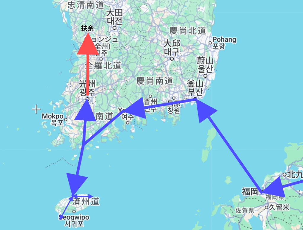 今日の目的地である扶余は観光地であるもののそこまで大きくはないため、光州からは直接移動できません。簡単に行けそうなのは以下のようなルートです。