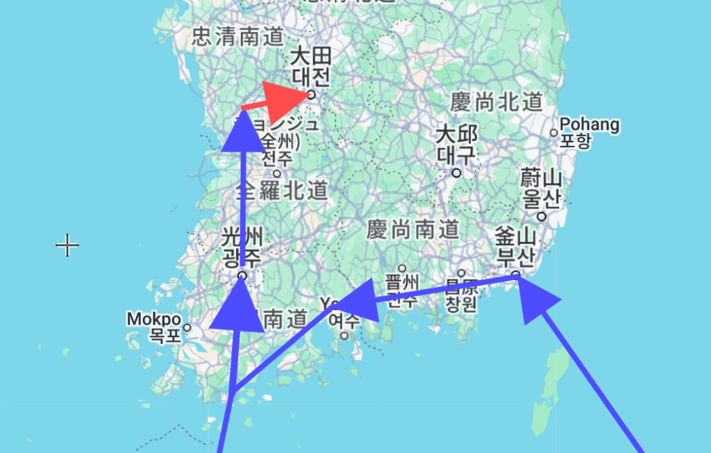 1時間半ほどで大田西部バスターミナルへ到着。大田のバスターミナルは二つあるのですが、どちらも地下鉄から離れておりちょっと不便です。バスもちょうどいい便がなさそうだったのでタクシーで移動。
